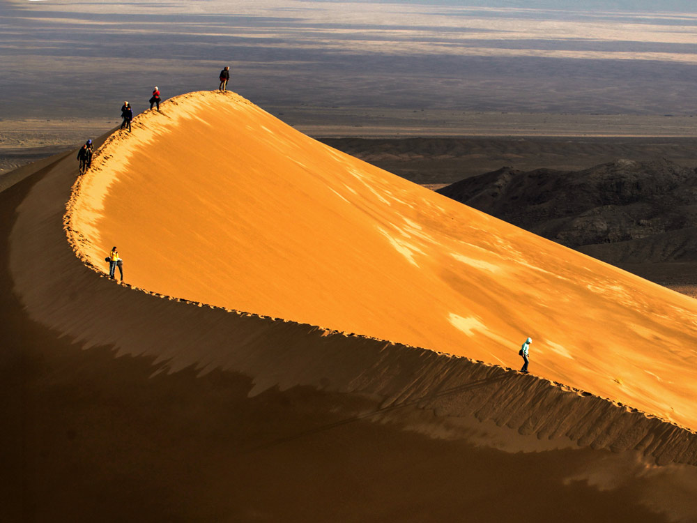 Śpiewająca Wydma wznosi się w Parku Narodowym Ałtyn Emel, na północny wschód od Ałmaty. Tak naprawdę wydm jest tu więcej, a wokół wyrastają bardzo malownicze szczyty. Gdy wieje wiatr, piasek wydaje z siebie charakterystyczny odgłos, który komuś skojarzył się ze śpiewem – stąd nazwa. Wspinaczka na górę piachu jest dość męcząca, ale widok z góry zdecydowanie wart jest poświęcenia. Zupełnie innych wrażeń dostarczą nam kolorowe góry Aktau. To miejsce jedyne w swoim rodzaju. Wyglądające jak wielobarwne muszle masywy są tak niezwykłe, że spędzimy przy nich dużą część dnia.