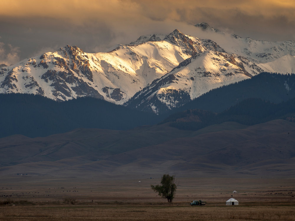 - Stepy z pasącymi się końmi i potężnym Tienszanem w tle